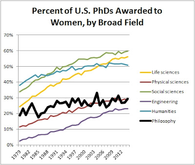 I’m sure there are many explanations for the stagnation in philosophy, but one may be that philosophy is a neglected field. Certainly it doesn’t get the grants or attention of any of the STEM fields, so the fact of its embarrassing gender proportions has not been subjected to the scrutiny of the STEM fields. There is no NSF ADVANCE program for philosophy, etc.